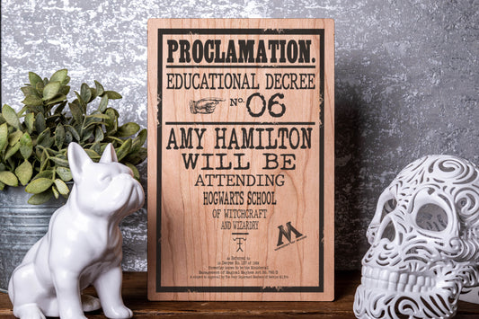 Harry Potter Style Attending Hogwarts Proclamation Personalised Laser Engraved Wood Board